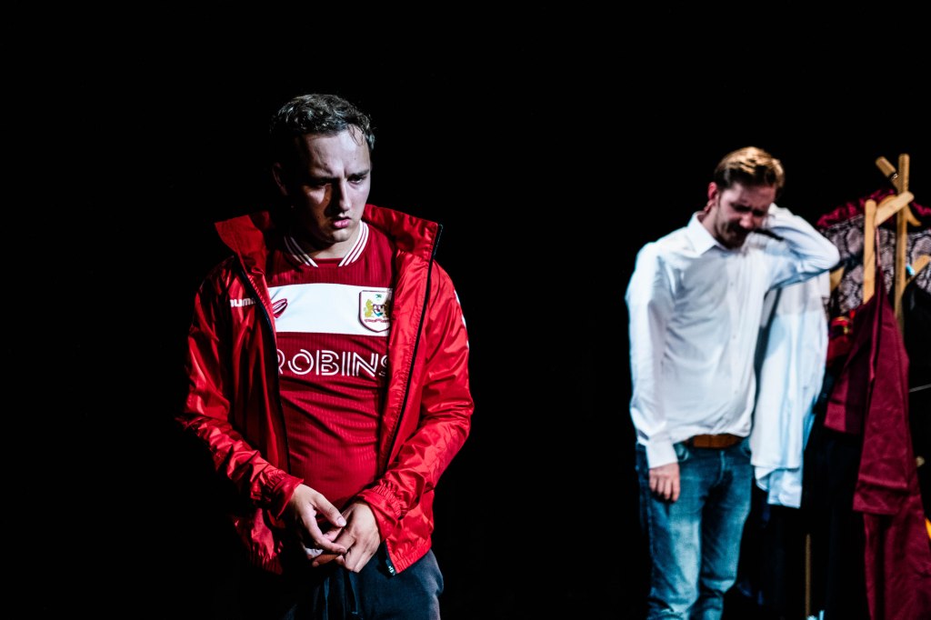Archie, the footballer, immediately conjures the shadows of of John Donnelly’s play (and later film) The Pass, Luke Hewitt giving a wonderful performance as this figure who — despite having dedicated his life to training his body — still has no idea what to do with his hands. He’s the physicality of someone who yearns to be in motion, constrained by circumstances and the creatively used bounds of the small playing space. It’s wonderful work, compulsively watchable.